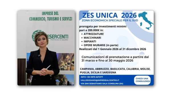 Confesercenti Vallo di Diano: ZES Unica 2026, al via le comunicazioni per il credito d’imposta