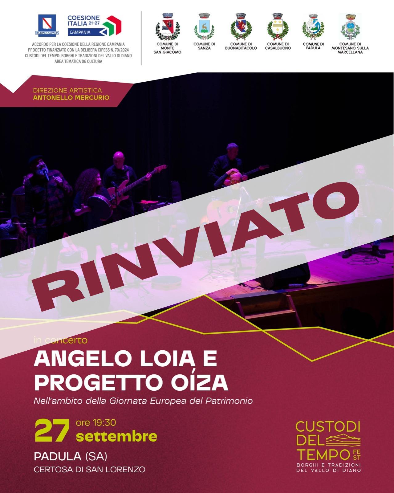 Il concerto di Angelo Loia & Progetto Oìza, previsto per sabato 27 settembre alle ore 19.30 presso la Certosa di San Lorenzo a Padula nell’ambito della rassegna Custodi del Tempo Fest, è stato rinviato a data da destinarsi.