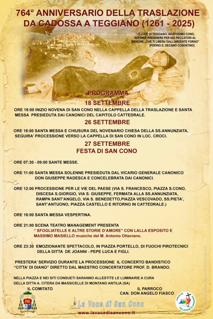 Oggi, 27 settembre, la comunità di Teggiano celebra una delle sue ricorrenze più significative: il 764° anniversario della Traslazione di San Cono dal monastero di Cadossa alla città (1261-2025).