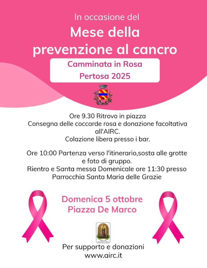 In occasione del mese della prevenzione al cancro e della campagna promossa dall’AIRC (Associazione italiana per la Ricerca sul Cancro), il Comune di Pertosa in collaborazione con la Parrocchia “Santa Maria delle Grazie” organizza l’iniziativa “CAMMINATA IN ROSA”.