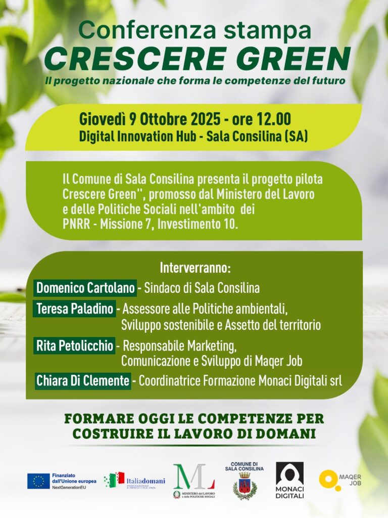 Il Comune di Sala Consilina, in collaborazione con Maqer Job Srl e Monaci Digitali, lancia il progetto pilota “Crescere Green”, promosso dal Ministero del Lavoro nell’ambito del PNRR (Missione 7, Investimento 10). L’iniziativa mira a formare cittadini e giovani sulle competenze richieste dalla transizione ecologica e digitale, con un forte focus su inclusione sociale e sviluppo territoriale.
