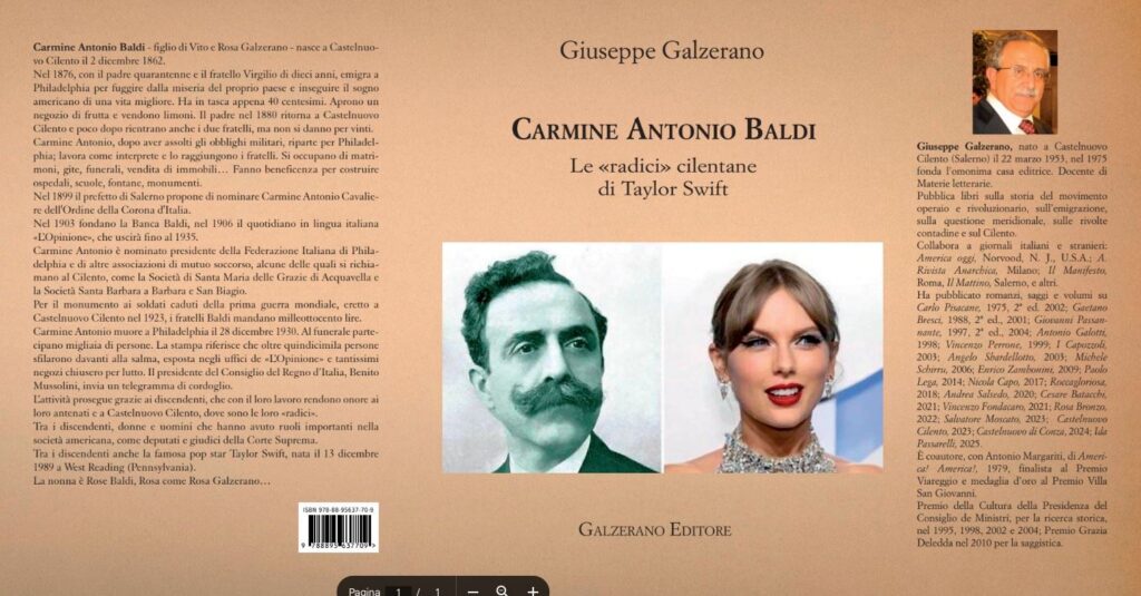 Il plico conteneva quattro copie del libro dello stesso Galzerano, “Carmine Antonio Baldi. Le ‘radici’ cilentane di Taylor Swift”, inviati a un congiunto della pop star, recentemente in visita a Castelnuovo Cilento, dove è stata intitolata una via ad Antony Balbi, antenato della cantante.