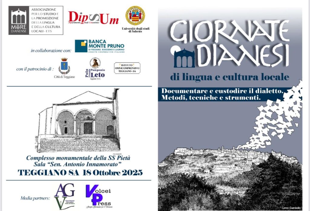 Continua a Teggiano lo studio sul dialetto. Nel quadro delle iniziative previste dalla convenzione recentemente stipulata tra Mōre Dianense – associazione per la promozione e lo studio della lingua e della cultura locali – aTeggiano ed il Dipartimento di Studi Umanistici dell’ Università degli Studi di Salerno si terrà il prossimo 18 ottobre con inizio alle ore 17.00, nella sala “Senatore Antonio M. Innamorato” del complesso monumentale della SS. Pietà di Teggiano, il primo evento delle Giornate dianesi di lingua e cultura locale.