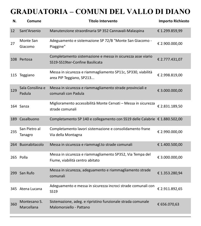 La Regione Campania ha appena approvato interventi per 1 miliardo di euro sul Bando Strade regionali. Nel solo Vallo di Diano questo si traduce in un finanziamento da 33milioni 999mila 546,78 euro su 13 progetti, alcuni dei quali intercomunali.