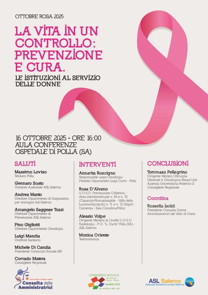 Nell’ambito delle iniziative dedicate a Ottobre Rosa, il mese della prevenzione del tumore al seno e della salute della donna, giovedì 16 ottobre 2025, con inizio alle ore 16:00, presso l’Aula Conferenze dell’Ospedale di Polla, si terrà l’incontro dal titolo “La vita in un controllo: prevenzione e cura. Le istituzioni al servizio delle donne”. L’iniziativa è promossa dalla Consulta delle Donne Vallo di Diano, Tanagro e Alburni, con il supporto del Consorzio Sociale Vallo di Diano – Tanagro – Alburni (Ambito S10) e il patrocinio dell’ASL Salerno.