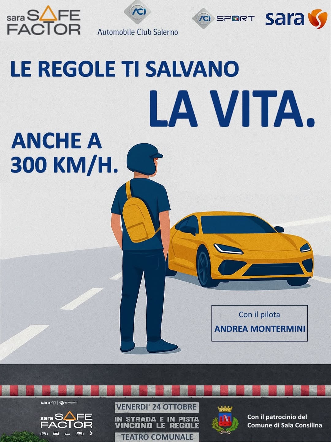 Il 24 ottobre gli studenti del triennio di tutti gli indirizzi dell’Istituto d’Istruzione Superiore “Marco Tullio Cicerone” di Sala Consilina parteciperanno all’evento di educazione stradale “Sara Safe Factor – Le regole ti salvano la vita. Anche a 300 km/h”, promosso da ACI Salerno e Sara Assicurazioni, con il patrocinio del Comune di Sala Consilina.