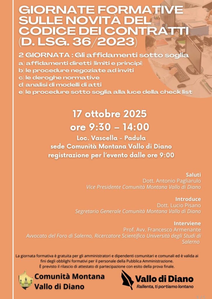 Si terrà venerdì 17 ottobre prossimo la seconda giornata formativa dedicata alle novità introdotte dal Decreto Legislativo 36 del 2023, il nuovo Codice dei Contratti. Dopo il successo della prima giornata, torna l’approfondimento sul Codice degli Appalti. Il tema “gli affidamenti sotto soglia”, è in programma dalle 9.30 presso la sede della Comunità Montana Vallo di Diano, in località Vascella a Padula.