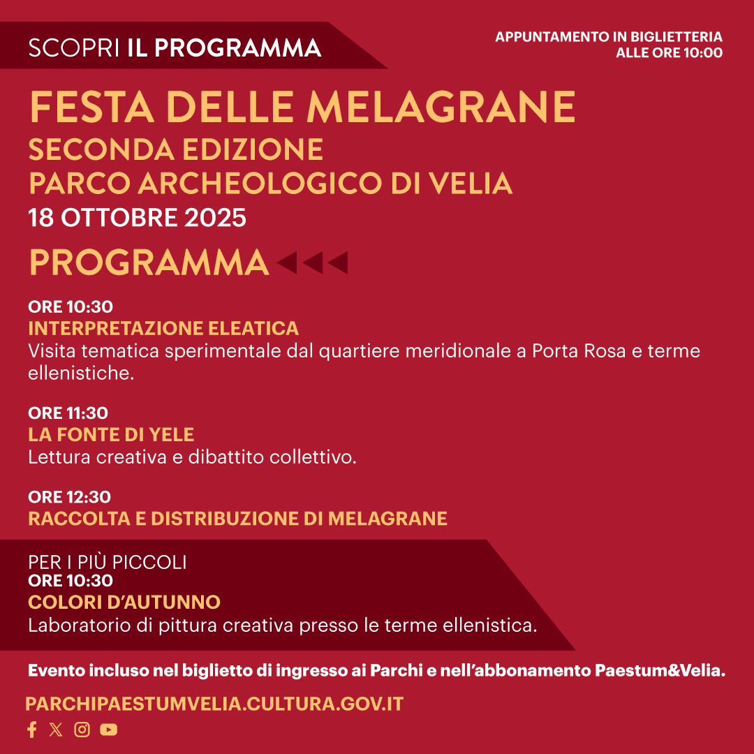 Sabato 18 ottobre, il Parco archeologico di Velia si tinge dei colori e dei profumi dell’autunno con la seconda edizione della Festa della Melagrana, una giornata che unisce cultura, natura e gusto.