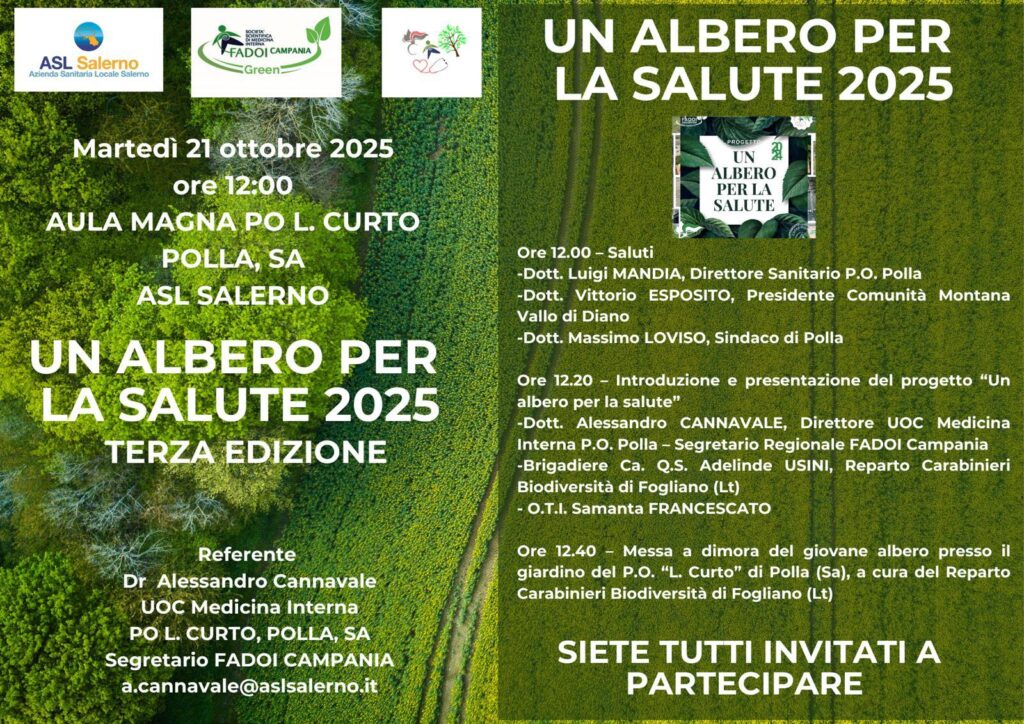 Un gesto concreto per un futuro più sano, che unisce cura della persona e tutela dell’ambiente. Il presidio ospedaliero “Luigi Curto” di Polla aderisce con entusiasmo al progetto nazionale “Un Albero per la Salute”. L’iniziativa è promossa dalla FADOI, (Federazione delle Associazioni dei Dirigenti Ospedalieri Internisti – Sezione Campania), in partnership con l’Arma dei Carabinieri attraverso il suo Raggruppamento Biodiversità.