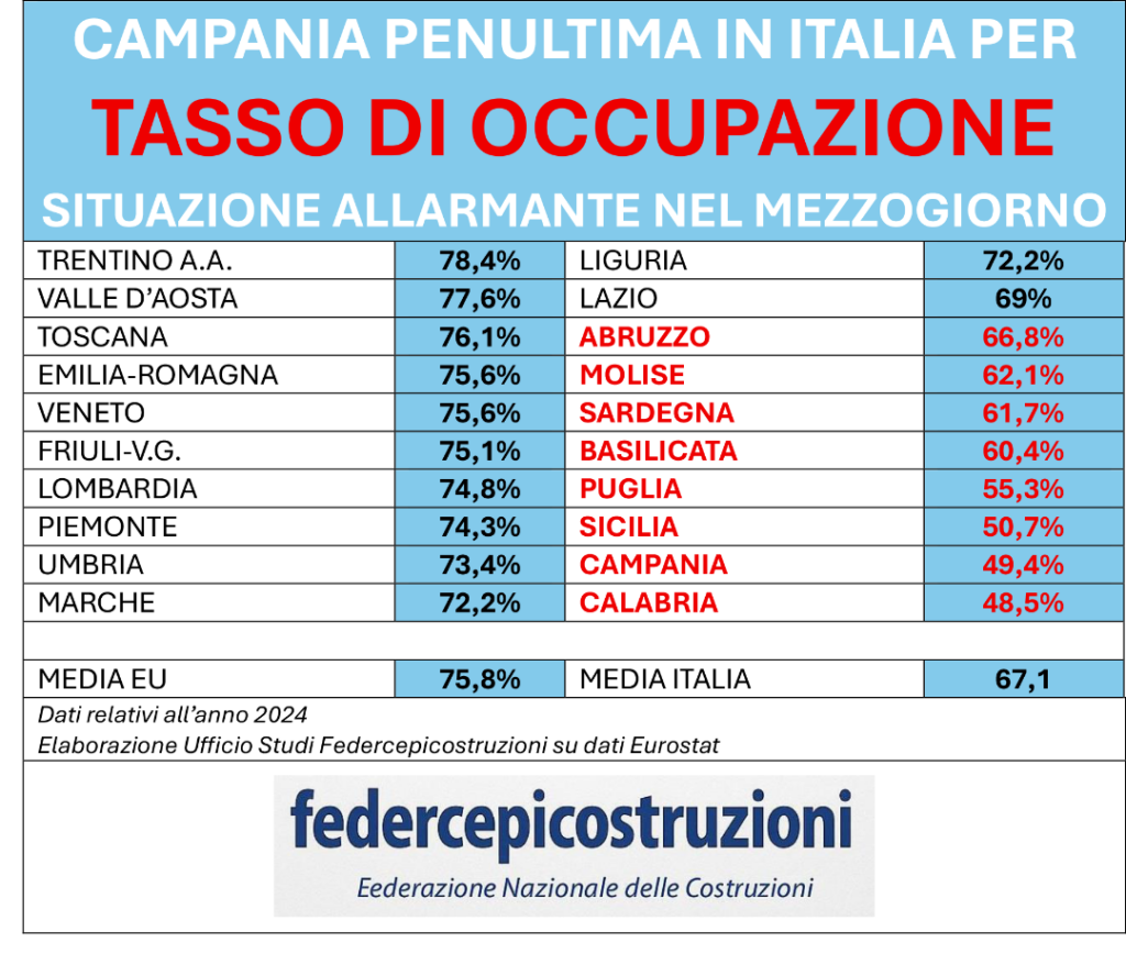 Un divario che non si colma, anzi, che rischia di aggravarsi. È la fotografia scattata dall’Ufficio Studi di Federcepicostruzioni sul mercato del lavoro italiano, che rivela una frattura sempre più profonda tra il Nord e il Sud del Paese. I dati Eurostat 2024, elaborati dalla Federazione, dipingono un quadro allarmante: il tasso di occupazione medio in Italia è del 67,1%, ma questa cifra nasconde due realtà opposte. Se le regioni del Nord viaggiano a ritmi sostenuti, superando ampiamente il 75%, il Mezzogiorno arranca, fermo a una media che non raggiunge il 55%.