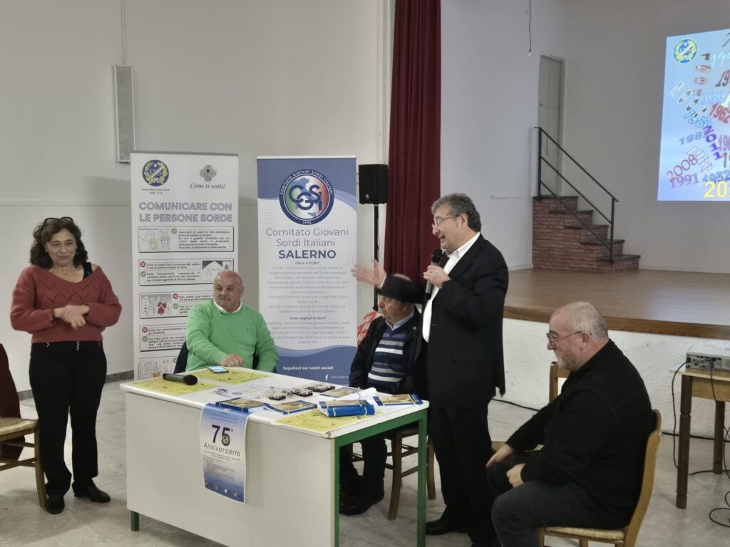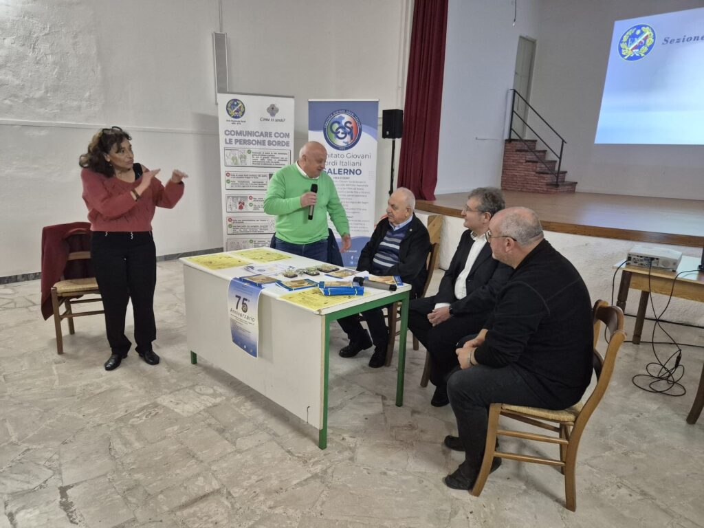 Successivamente, nel Cinema Parrocchiale “Mons. Vittorio Lamattina”, si è svolto un incontro partecipato e toccante, nel corso del quale il Presidente della Sezione ENS di Salerno, Cav. Angelo Santoro, ha consegnato una pergamena di riconoscenza al Sindaco e alla comunità di Caggiano. Un gesto simbolico ma denso di significato, con cui l’ENS ha voluto ringraziare il paese per l’attenzione e la sensibilità dimostrate nel sostenere le persone sorde e nel favorire una cultura dell’inclusione.