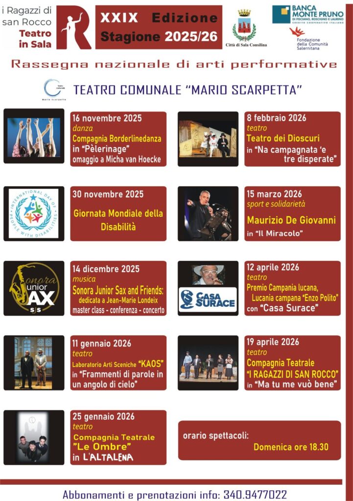 Ospitata dal Teatro Comunale Mario Scarpetta di Sala Consilina, con la stagione 2025-2026 la storica rassegna di arti performative Teatro in Sala giunge alla XXIX edizione. Organizzata dall’associazione di promozione sociale “i Ragazzi di san Rocco”, in collaborazione con l’Amministrazione Comunale di Sala Consilina, la rassegna si avvale del prezioso sostegno della Banca Monte Pruno che ne riconosce il radicamento sul territorio e il valore culturale.
