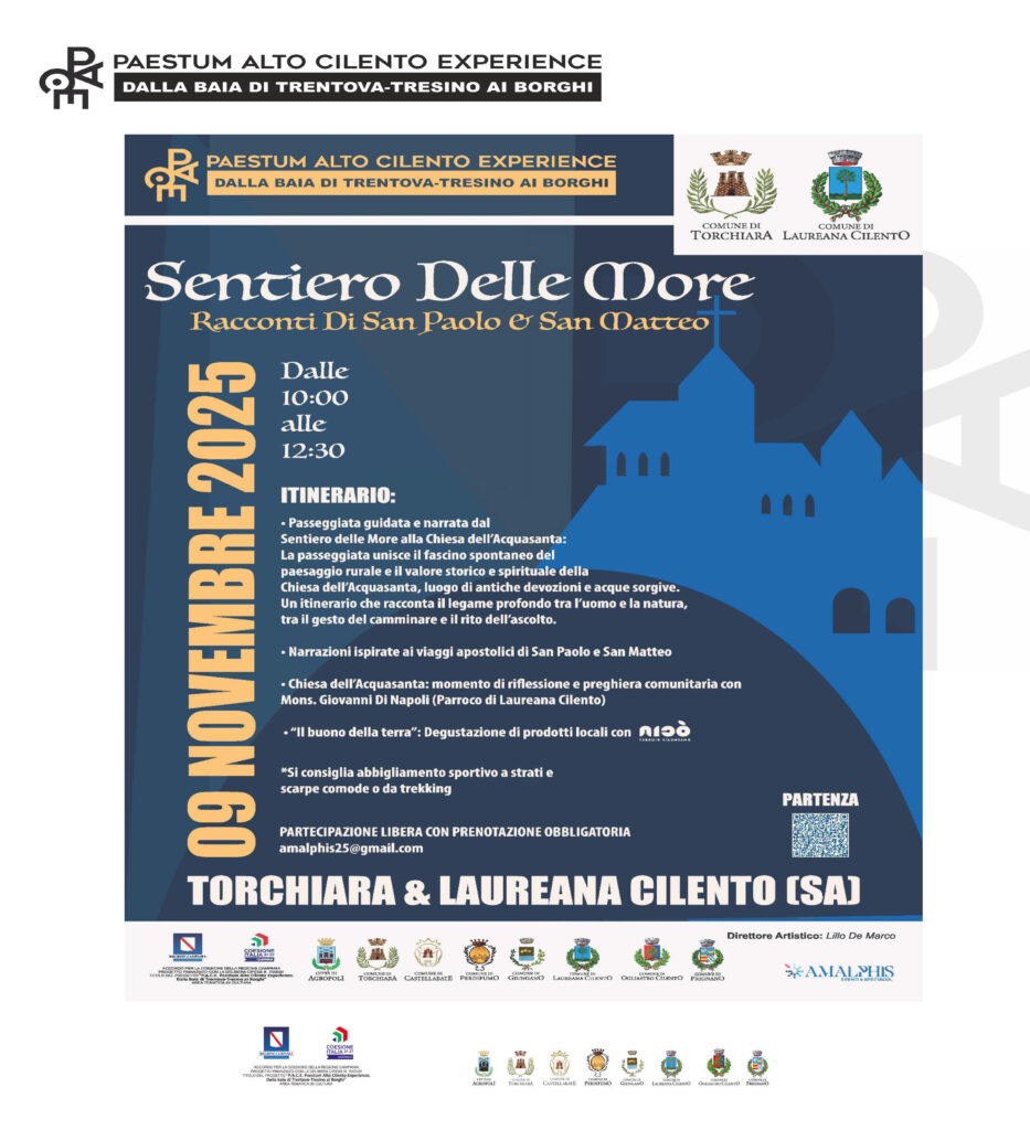 Il cammino partirà alle ore 10:00 da Torchiara e si concluderà presso la Chiesa dell’Acquasanta di Laureana Cilento, dove è previsto un momento di riflessione curato da Mons. Giovanni Di Napoli e degustazioni a cura di Nicò – Terroir Cilentano. Un’esperienza gratuita e aperta a tutti, pensata per unire spiritualità e scoperta del territorio.