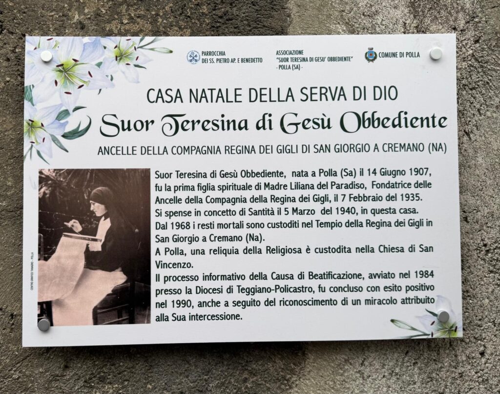 Sabato 8 novembre a Polla, dinanzi alla casa natale di Suor Teresina di Gesù Obbediente, in Via Crispi, è stata collocata una targa in memoria della Serva di Dio Suor Teresina di Gesù Obbediente della Compagnia Regina dei Gigli di San Giorgio a Cremano. Presenti il sindaco di Polla, Massimo Loviso, l’assessore Rossella Isoldi, i parroci don Pasquale Gaito e don Luigi Terranova, , don Franco Maltempo e una folta delegazione di fedeli di Suior Teresina , venuti in pullman da San Giorgio a Cremano guidati dalle Ancelle della Regina dei Gigli. A seguire è stata celebrata una Messa Solenne nella vicina Chiesa di San Vincenzo dove è custodita una reliquia della religiosa, rappresentata dal velo della prima comunione.