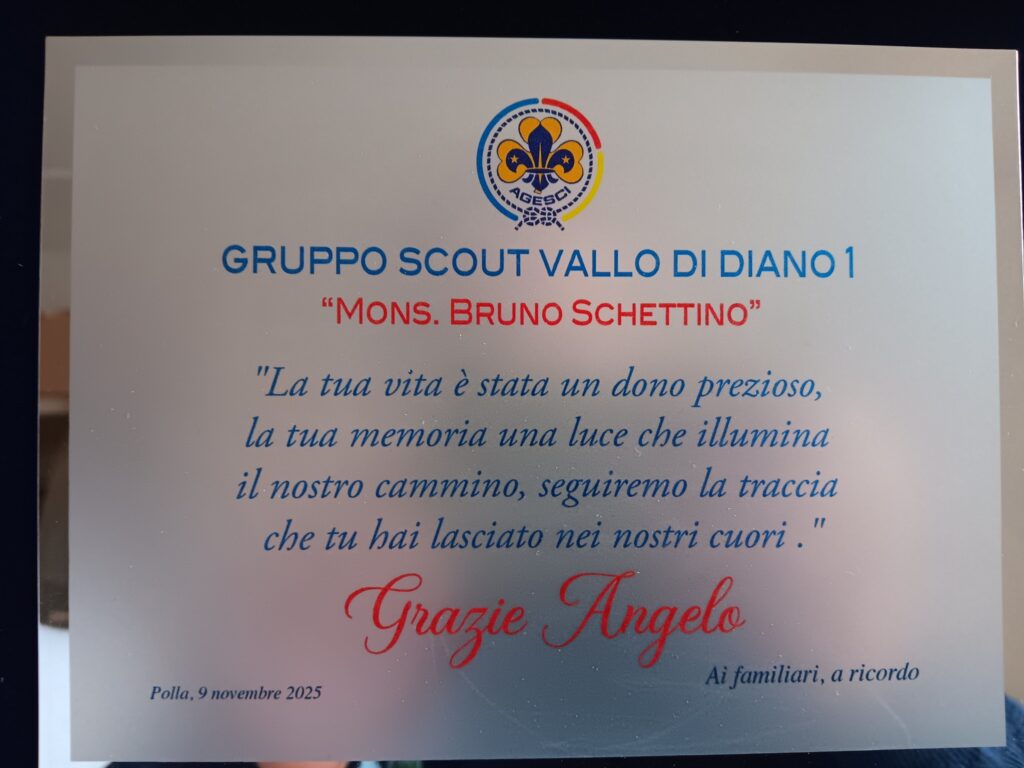 Particolarmente emozionante è stato il momento in cui, durante la celebrazione eucaristica, il Gruppo Scout Vallo di Diano 1 “Mons. Bruno Schettino” ha ricordato il compianto Angelo Sabini, Capo Scout del Gruppo, scomparso lo scorso maggio. Alla moglie Flamia e al figlio Gianmario, infatti, è stata donata una targa nel ricordo dell’opera di Angelo.