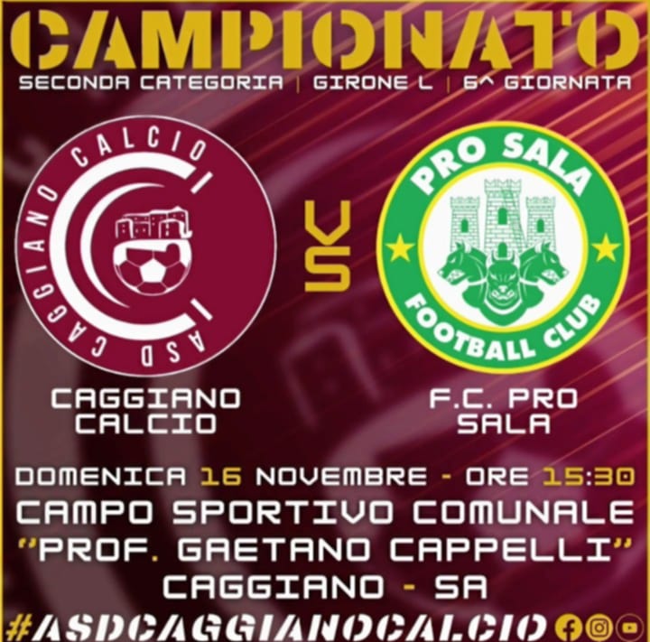 Domenica 16 novembre, alle 15:30, si disputerà al campo sportivo comunale “Prof. Gaetano Cappelli” di Caggiano la sfida tra Caggiano Calcio e F.C. Pro Sala, valida per la 6ª giornata del campionato di Seconda Categoria – Girone L. L’incontro sarà trasmesso in diretta online tramite il canale ufficiale You Tube dell’ASD Caggiano Calcio, a questo link: https://youtube.com/@caggianocalcio?si=s_IRa3Zq3X0TAp0A .