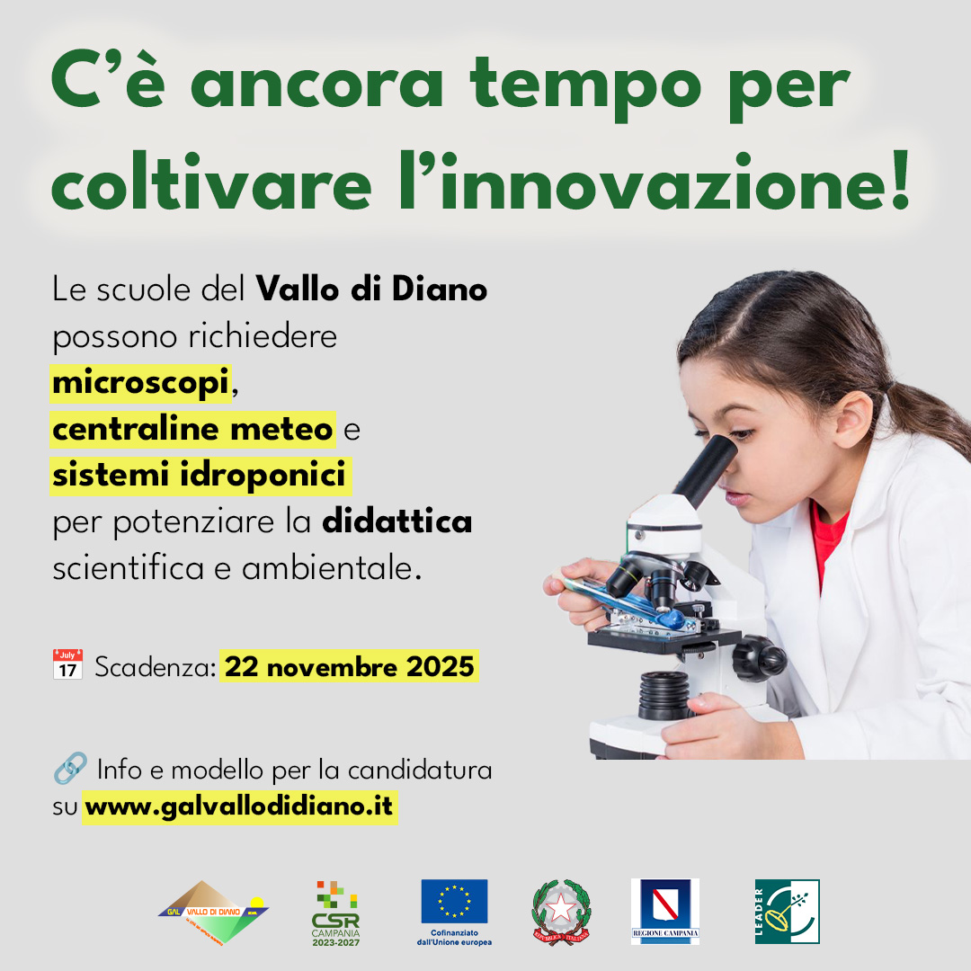 Il Gal Vallo di Diano ha lanciato un avviso pubblico per fornire gratuitamente attrezzature didattiche agli istituti scolastici del territorio. L’iniziativa è specificamente dedicata al potenziamento della didattica scientifica e ambientale.