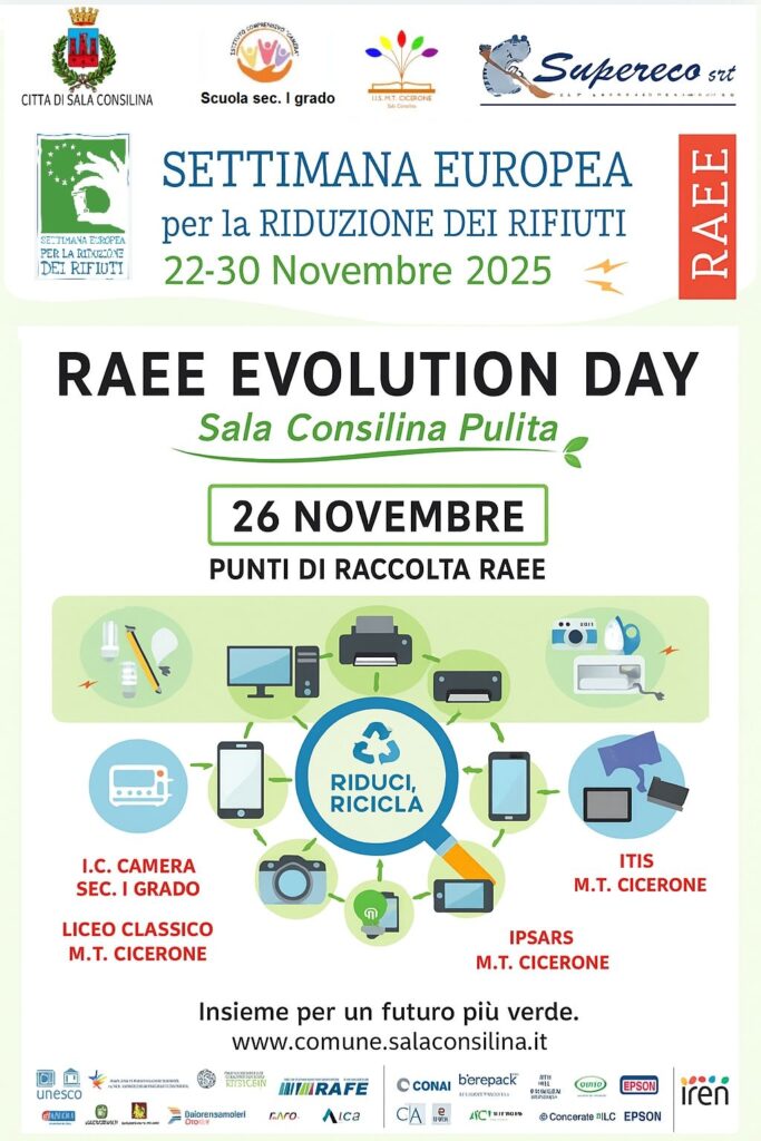 In occasione della Settimana Europea per la Riduzione dei Rifiuti (SERR) 2025, in programma dal 22 al 30 novembre, l’istituto comprensivo “G. Camera” di Sala Consilina ed Atena Lucana, ed il liceo “M.T. Cicerone”si preparano a ospitare un’iniziativa di forte impatto ambientale e educativo: l’“RAEE Evolution Day – Sala Consilina Pulita”.