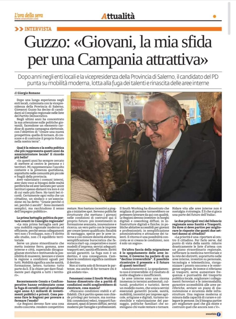 Temi che Guzzo ha rilanciato anche nell’intervista pubblicata su “L’Ora della Sera”, dove ha tracciato la sua idea di sviluppo regionale. Nell’intervista, Guzzo sottolinea la necessità di trasformare la Campania in una Regione “capace di attrarre, trattenere e far rientrare i propri talenti”. “Ogni ragazzo che parte è una perdita per tutti noi”, afferma, richiamando la necessità di politiche strutturate: infrastrutture moderne, mobilità efficiente, servizi stabili e luoghi di lavoro che offrano futuro e qualità. La parola chiave è competitività: non contro altre realtà, ma come premessa per fare della Campania una terra dove restare non sia un’eccezione, ma una scelta naturale.