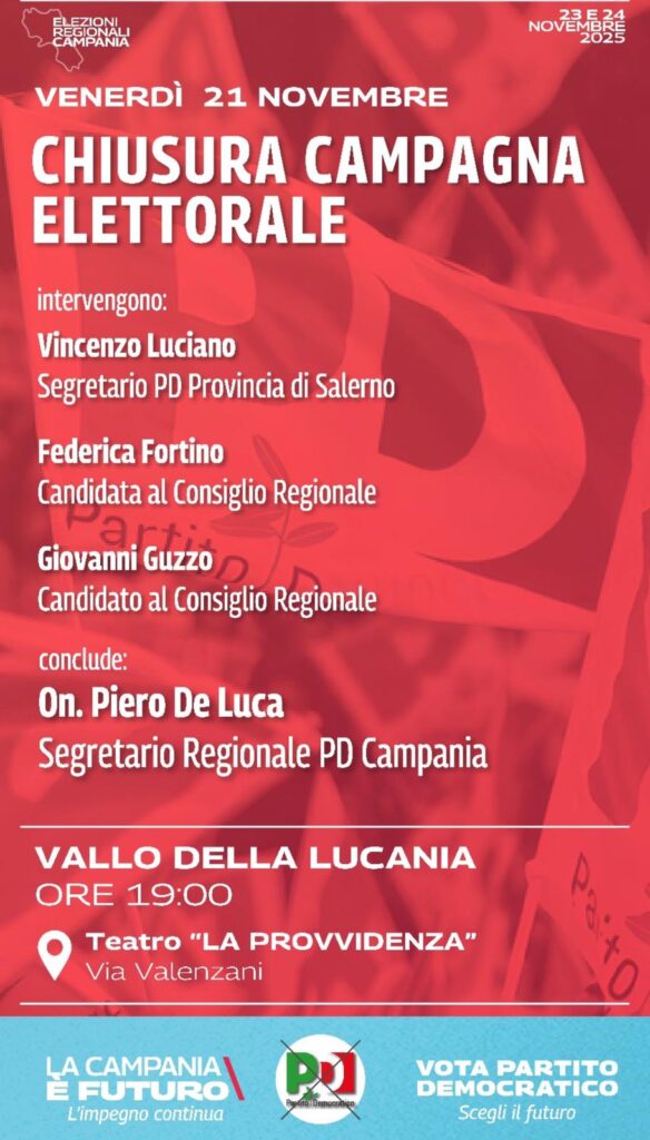 Si conclude questa sera, venerdì 21 novembre, la campagna elettorale di Giovanni Guzzo, candidato al Consiglio Regionale della Campania, con un appuntamento pubblico di grande rilievo al CineTeatro “La Provvidenza” di Vallo della Lucania, alle ore 19.00. Una scelta che racconta molto dell’identità politica e personale del candidato.