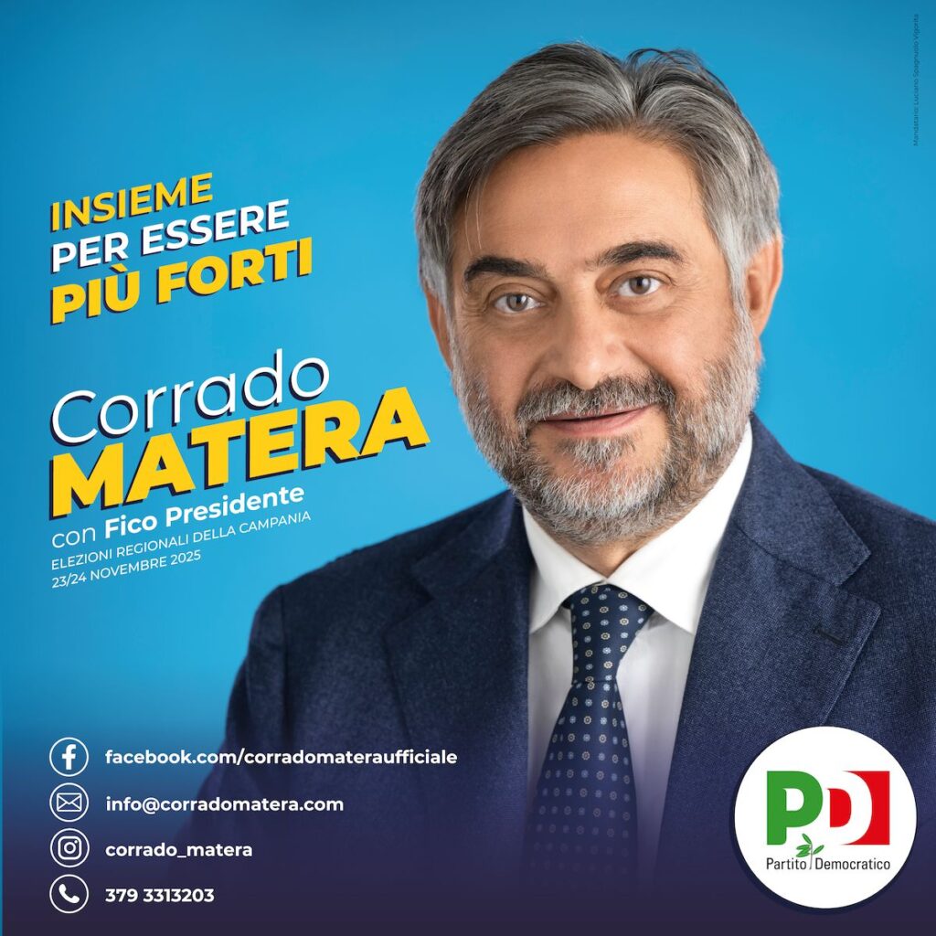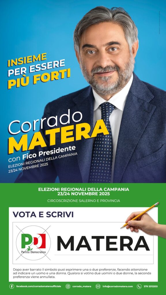 “Siamo all’ultimo passo di un percorso straordinario –sottolinea Corrado Matera- fatto di persone, di idee, di territori che chiedono rispetto, presenza e sostegno concreto. In questi giorni ho ascoltato migliaia di voci, diverse ma unite dalla stessa speranza: continuare a costruire insieme il futuro della Campania”.