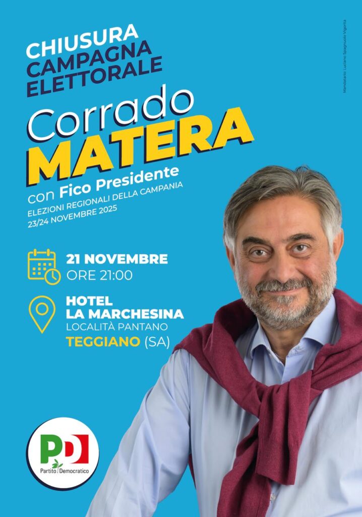 Corrado Matera, consigliere regionale uscente candidato alle Elezioni Regionali della Campania 2025 nella lista del Partito Democratico, conclude questa sera a Teggiano, con inizio alle ore 21 presso l’Hotel La Marchesina, il percorso di una campagna elettorale intensa, partecipata e ricca di incontri.