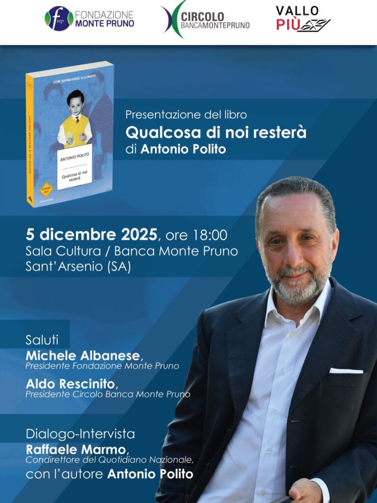 L’incontro, promosso dalla Fondazione Monte Pruno in collaborazione con il Circolo Banca Monte Pruno e Vallo Più, si aprirà con i saluti istituzionali di Michele Albanese, Presidente della Fondazione e della Banca Monte Pruno, e Aldo Rescinito, Presidente del Circolo Banca Monte Pruno. A seguire, un dialogo-intervista che vedrà protagonisti Antonio Polito, giornalista, scrittore ed editorialista tra le voci più autorevoli del panorama nazionale, e Raffaele Marmo, Condirettore del Quotidiano Nazionale, che accompagnerà l’autore in un confronto ricco di riflessioni e domande sul significato della vita, della memoria e del lascito umano.