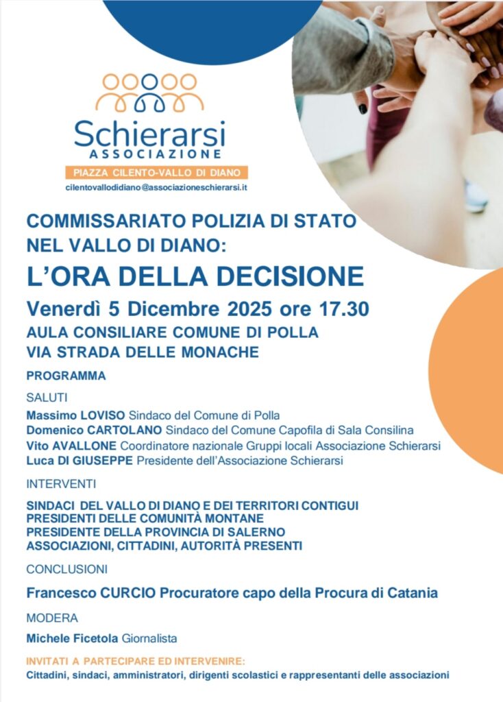 Venerdì 5 dicembre, alle 17.30, presso l’aula consiliare del Comune di Polla, si terrà l’incontro pubblico dal titolo “Commissariato di Polizia di Stato nel Vallo di Diano: L’ora della decisione”. L’iniziativa, moderata dal giornalista Michele Ficetola, è della locale associazione “Schierarsi – Piazza Cilento – Vallo di Diano“.