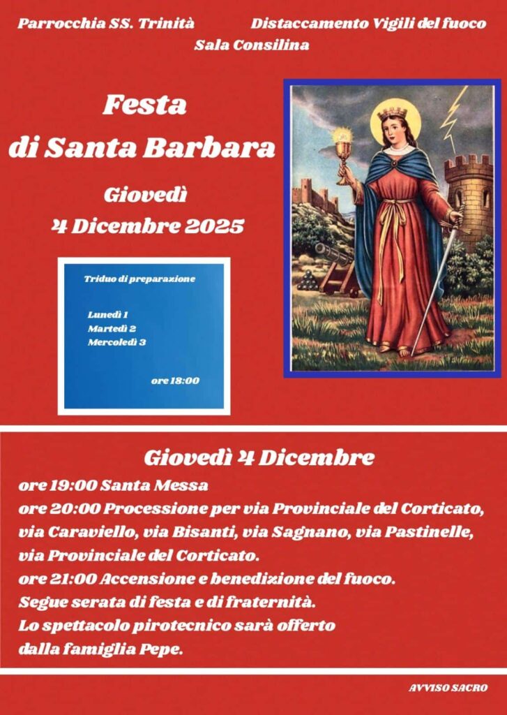 La parrocchia, con il suo parroco don Gabriele Petroccelli, unitamente ai Vigili del Fuoco del Distaccamento di Sala Consilina, hanno con Santa Barbara un legame forte e consolidato nel tempo ed il 4 dicembre diventa l’occasione per ritrovarsi in preghiera ai piedi della Santa.