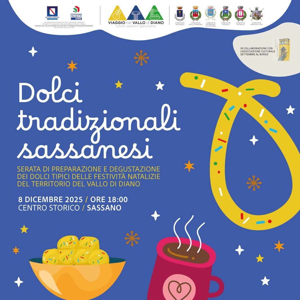 Lunedì 8 dicembre, in occasione della Festa dell’Immacolata, a partire dalle ore 19:00, il centro storico di Sassano si trasformerà in un vero e proprio Villaggio Natalizio, con il percorso gastronomico “Dolci tradizionali sassanesi”, dedicato alla scoperta dei sapori autentici del Vallo di Diano. “L’evento – spiega il sindaco Domenico Rubino – è realizzato dall’amministrazione comunale in collaborazione con l’Associazione Settembre al Borgo, e proporrà un’esperienza unica tra profumi, luci e atmosfere natalizie. Ci saranno laboratori dal vivo e degustazioni guidate dei dolci tipici delle festività, preparati dalle signore dell’associazione secondo ricette tradizionali, tramandate di generazione in generazione”. In aggiunta ai dolci, grandi e piccini potranno gustare pop-corn, bevande calde e altre delizie per scaldare le serate invernali. La serata si concluderà con l’arrivo di Babbo Natale in Piazza Umberto I, pronto a ricevere le letterine dei bambini e regalare momenti di gioia e magia natalizia.