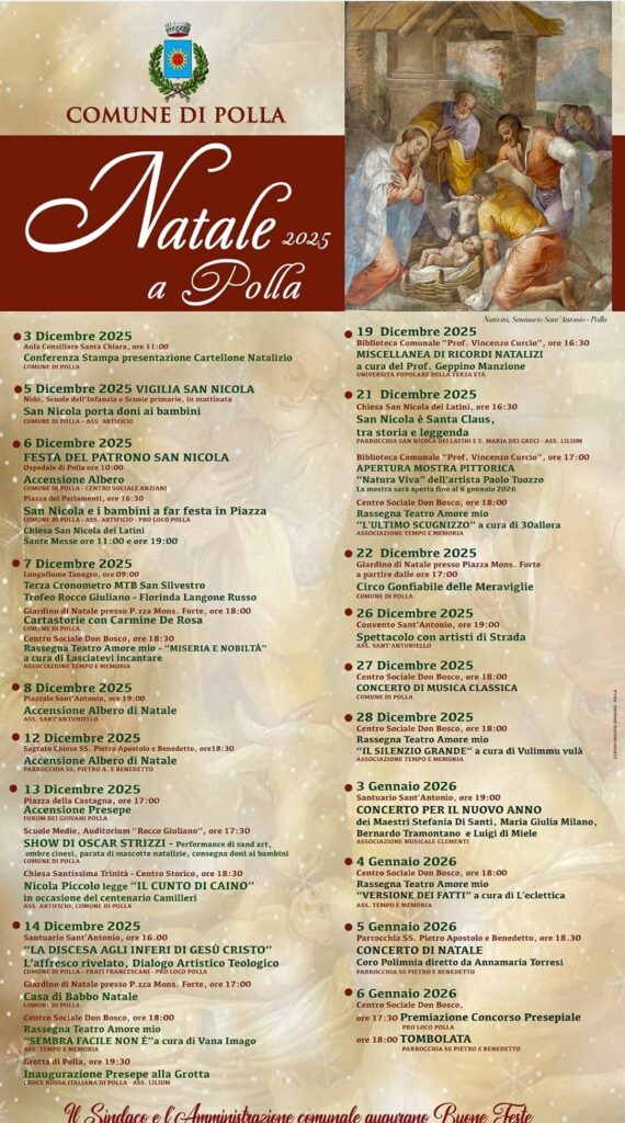 Di rilievo anche il “Concerto per il nuovo anno” in programma il 3 gennaio presso il Santuario di Sant’Antonio con i Maestri Stefania Di Santi, Maria Giulia Milano, Bernardo Tramontano e Luigi Di Miele. Un altro concerto è previsto per il 5 gennaio presso la Parrocchia dei SS. Pietro Apostolo e Benedetto ad opera del Coro Polimnia diretto da Annamaria Torresi. Da segnalare anche l’accensione di diversi alberi di Natale in varie zone del paese e il presepe nella Grotta che sarà inaugurato domenica 14 dicembre. Le manifestazioni non incideranno sulla rassegna teatrale “Teatro amore mio”, organizzata dall’Associazione Tempo e Memoria”, in programma ogni domenica sul palco del Centro Sociale Don Bosco. Da parte sua il vicesindaco Giuseppe Curcio ha annunciato il gemellaggio tra Polla e due città della Croazia (Nowska) e della Macedonia (Konce): prossimamente una delegazione di 12 persone con lo stesso Curcio, gli assessori Giuliano e Trafuoci e Cristina Mele e Gianna Valletta volerà in Croazia per incontrare a Nowska le delegazioni dei due paesi che saranno a loro volta ospitate a Polla nel prossimo periodo estivo. A conclusione della conferenza stampa l’intervento dell’assessore Rossella Isoldi: “Ancora una volta grazie al lavoro di squadra è stato possibile realizzare un cartellone ricco di eventi per tutte le età che si concluderà il 6 gennaio quando ci sarà la premiazione del Concorso Presepiale e una Tombolata nella giornata tradizionalmente dedicata alla Befana”.