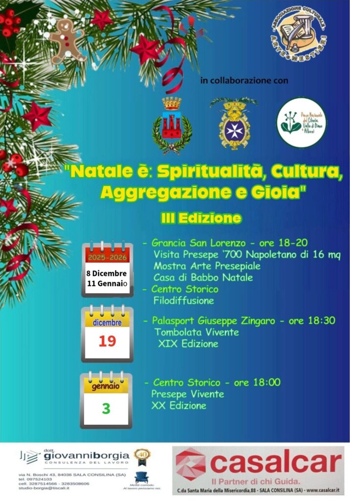 All’evento benefico parteciperanno scuole di danza del Paese e artisti del posto, che a titolo assolutamente gratuito, faranno vivere agli spettatori un momento di allegria, spettacolo, il tutto finalizzato alla raccolta di fondi in favore dell’Associazione Conrett Ets. Per le iscrizioni alla tombolata chiamare i numeri indicati nella locandina. Le attività natalizie proseguiranno con la realizzazione del Presepe Vivente giorno 3 gennaio 2026 a partire dalle ore 18,00 nel centro storico di Sala Consilina. L’idea è quella di realizzare un momento di preghiera e meditazione itinerante, raccontando le scene dall’Annunciazione all’Adorazione dei Magi, in un percorso lungo le strade del Centro Storico. Questo evento viene realizzato in collaborazione con le parrocchie di Santo Stefano e San Pietro. L’Associazione Arte e Mestieri, da sempre attiva per la divulgazione delle tradizioni e della cultura, vi aspetta per vivere insieme il Natale 2025 .