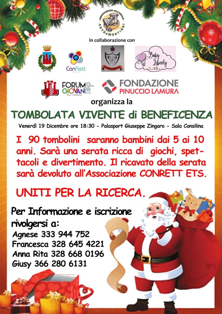 Le iniziative continueranno giorno 19 dicembre 2025 a partire dalle ore 18,30 presso il Palasport Giuseppe Zingaro di Sala Consilina, per la Tombolata Vivente di Beneficenza. L’Associazione Arte e Mestieri, infatti, in collaborazione con il Forum dei Giovani, l’Associazione Red Black, Baby Liberty e la Fondazione Pinuccio Lamura organizza una serata in favore dell’Associazione CONRETT ETS, quest’ultima pure tra gli organizzatori, per raccogliere fondi per la ricerca. La serata vedrà come protagonisti 90 bambini (dai 5 ai 10 anni) che interpreteranno i tombolini della tombola. La quota di iscrizione a bambino è di € 10,00, e la stessa include il cappellino di babbo natale, 1 cartella della tombola con numero equivalente a quello assegnato al bimbo /bimba, la foto con le varie mascotte presenti, 1 zucchero filato, 1 pop corn, 1 regalino da scartare appena il numero del bambino viene estratto, e tanti giochi, animazione e divertimento per più di 3 ore.