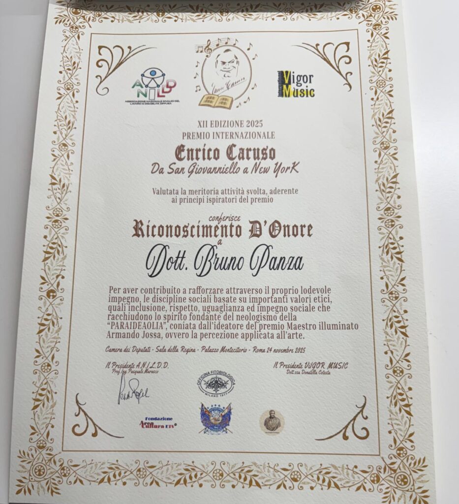 Importante riconoscimento per il fisioterapista di Polla Bruno Panza, insignito del “Premio Enrico Caruso da San Giovanniello a New York”. La manifestazione finale si è svolta a Roma nella suggestiva Sala della Regina della Camera dei Deputati, sottolineando l’alto profilo istituzionale e culturale dell’iniziativa. Questa la motivazione del riconoscimento: “Al Dott. Bruno Panza un fisioterapista che ha dedicato la sua vita a migliorare la qualità di vita delle persone con disabilità. La sua creatività e il suo impegno lo hanno portato a organizzare eventi musicali inclusivi, che rappresentano un vero e proprio strumento di terapia e di integrazione per i suoi pazienti. Per la sua visione innovativa e la sua dedizione alla cura delle persone lavorando con passione e dedizione per il loro recupero fisico e il loro reinserimento sociale”.