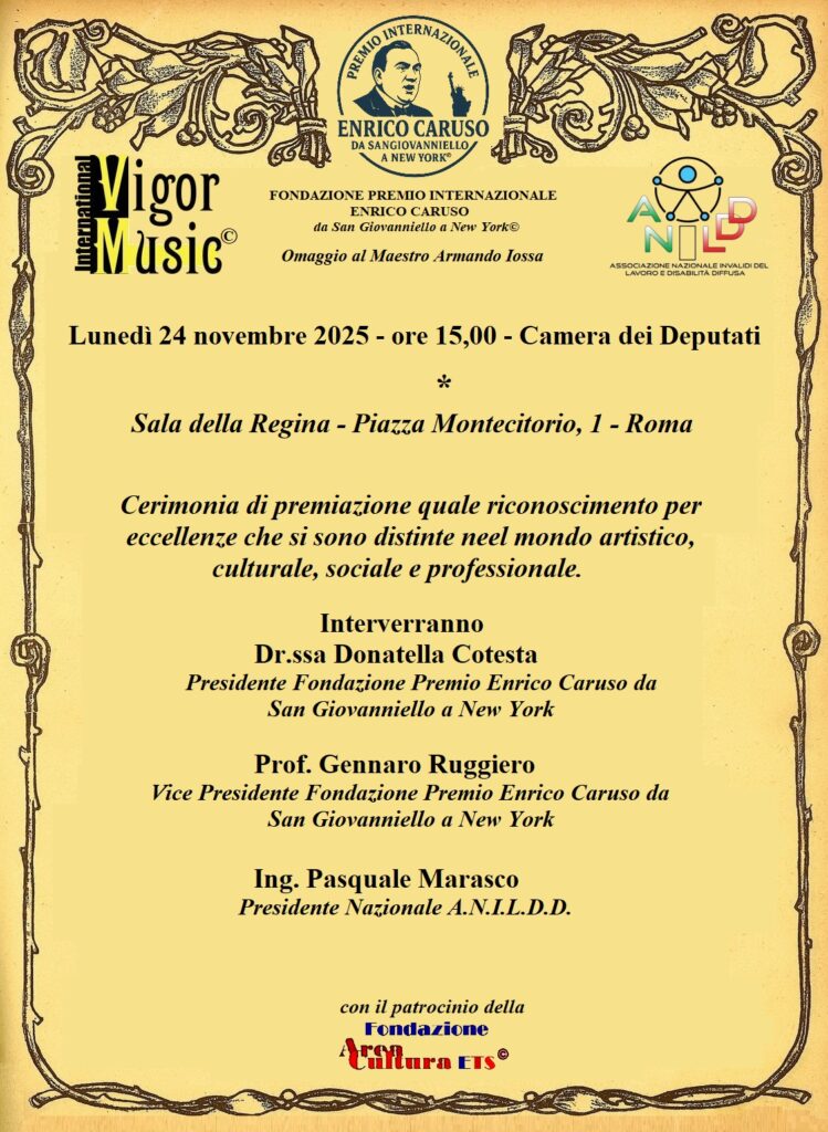 Giunto alla sua XII edizione il “Premio Internazionale Enrico Caruso da San Giovanniello a New York” si avvale del patrocinio di Area Cultura ETS ed ha confermato ancora una volta il proprio prestigio nel panorama culturale, rinnovando l’eredità del suo ideatore e direttore artistico, il compianto Maestro Armando Jossa e della sua straordinaria visione artistica, rinnovando lo spirito che lo ha sempre animato. L’iniziativa patrocinata dall’Associazione Nazionale del Lavoro e Disabilità Diffusa (A.N.I.L.D.D.) in sinergia con Vigor Music, ha celebrato il talento, la creatività e l’eccellenza italiana e internazionale nel nome di Enrico Caruso, l’artista che, partendo dall’umile quartiere napoletano di San Giovanniello, conquistò la scena internazionale fino ai trionfi del Metropolitan di New York.