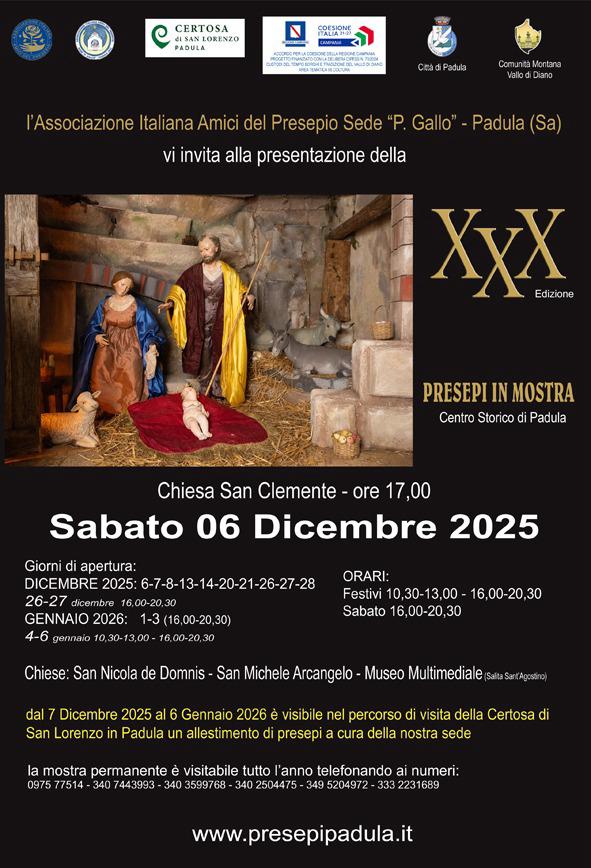 Anche quest’anno Padula vivrà la magia del presepio per merito della locale sezione “P.Gallo”, aderente all’Associazione Italiana del Presepio. L’inaugurazione della mostra, giunta alla XXX edizione, è previsto per questo pomeriggio nella Chiesa di San Clemente.