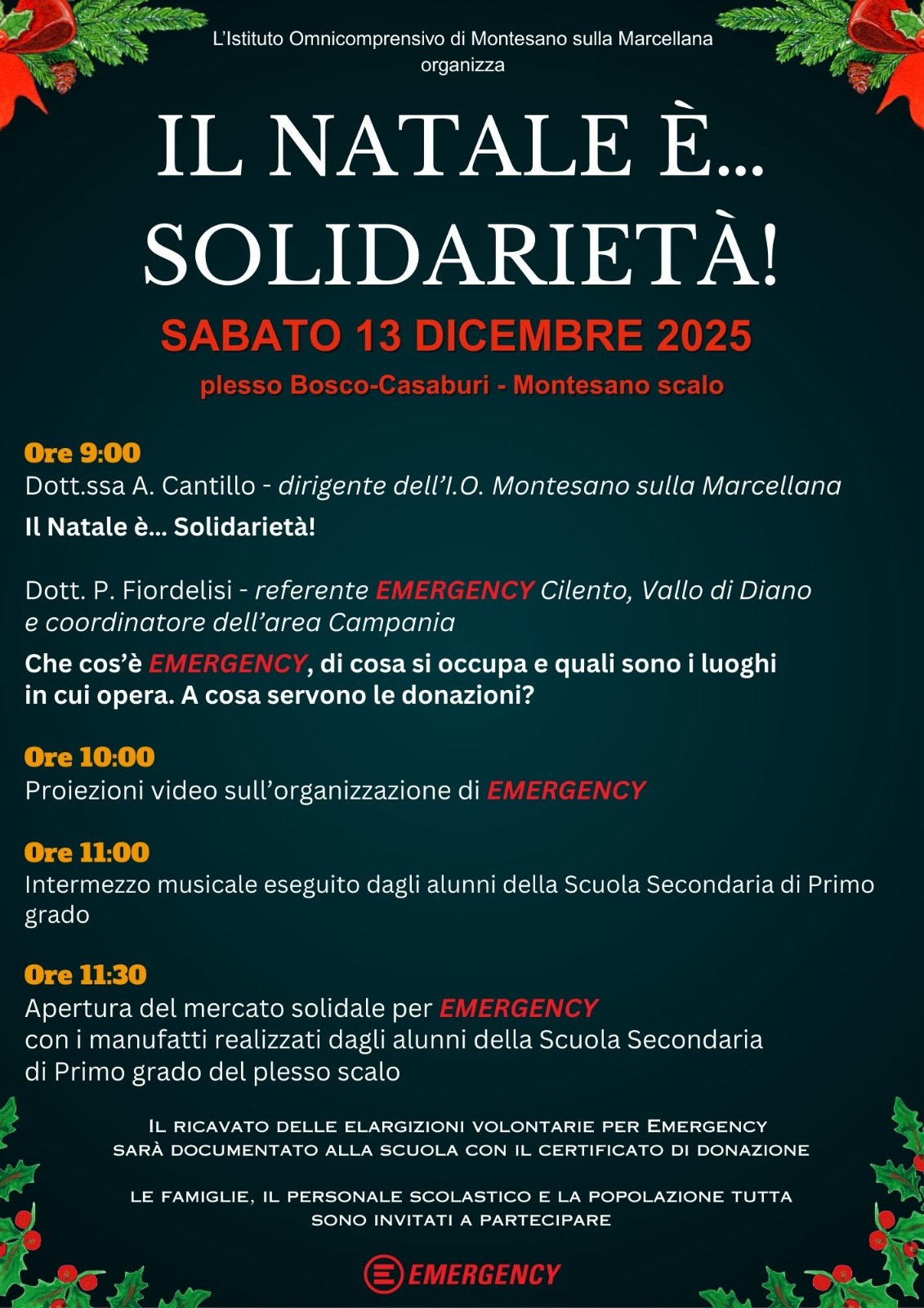 Ha preso il via nelle scorse settimane, presso l’Istituto scolastico di Montesano sulla Marcellana, il laboratorio “Natale è… Solidarietà!”, che si concluderà il 13 dicembre con un mercatino natalizio. L’iniziativa, promossa dalla dirigente scolastica Antonietta Cantillo, coinvolge gli alunni e il personale della scuola secondaria di primo grado di Montesano Scalo.