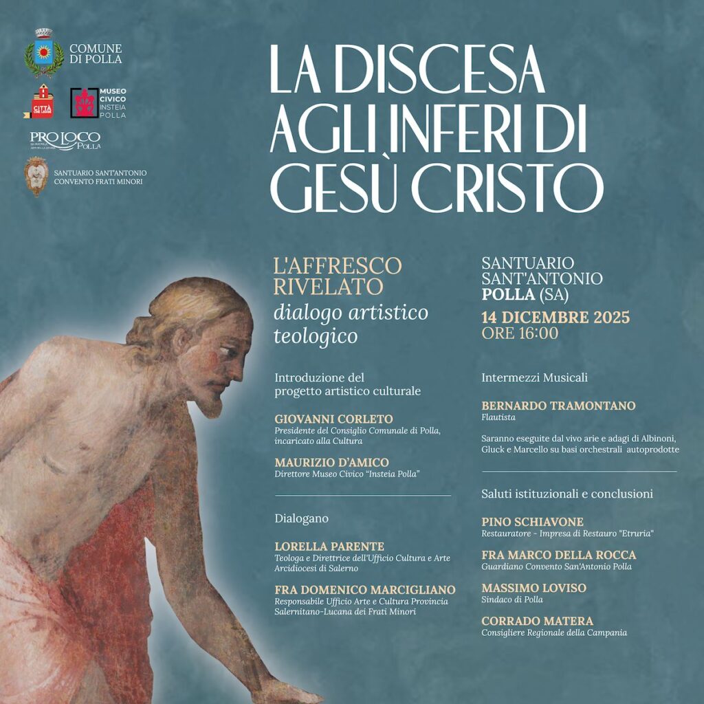 Gli inferi si presentano a noi attraverso una costruzione architettonica: Gesù con in mano una croce a stilo e con i segni della Resurrezione, della vittoria sulla morte, calpesta le porte abbattute. Adamo ed Eva sono già stati tratti fuori insieme con Giovanni Battista e altri profeti. “Una domenica dedicata al Santuario di Sant’Antonio, in particolare a un affresco rivelato “La discesa agli inferi” – spiega GIOVANNI CORLETO – presidente del Consiglio comunale di Polla e incaricato alla cultura. Uso la parola rivelato perché l’affresco era nascosto dalla coltre dei secoli e ora grazie ai lavori di restauro in corso, ci rivela il vero suo splendore e ci conduce verso verità nascoste”. L’amministrazione comunale, insieme ai frati francescani, ha voluto questo evento, affidandosi alla sapienza e al dialogo tra Lorella Parente, Teologa e Direttrice dell’Ufficio Cultura e Arte Arcidiocesi di Salerno e Fra Domenico Marcigliano, Responsabile Ufficio Arte e Cultura Provincia Salernitano-Lucana dei Frati Minori. Il dialogo sarà accompagnato da video, immagini e dagli intermezzi Musicali del flautista BERNARDO TRAMONTANO, con musiche dal vivo di arie e adagi di Albinoni, Gluck e Marcello su basi orchestrali autoprodotte. Non mancheranno i saluti di MAURIZIO D’AMICO Direttore del Museo Civico “Insteia Polla”, Pino SCHIAVONE, Restauratore – Impresa di Restauro “Eturia, FRA MARCO DELLA ROCCA, Guardiano Convento San’Antonio Polla e le conclusioni di MASSIMO LOVISO, Sindaco di Polla e CORRADO MATERA, consigliere regionale della Campania.