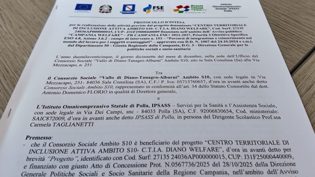È stato firmato a Polla il protocollo d’intesa tra il Consorzio Sociale Vallo di Diano – Tanagro – Alburni (Ambito S10) e l’Istituto Omnicomprensivo di Polla – indirizzo Servizi per la Sanità e l’Assistenza Sociale, relativo ai corsi OSS gratuiti riservati agli studenti diplomati presso l’Istituto Sociosanitario. La firma rende operativo un percorso formativo fortemente strategico per il territorio. L’accordo dà concreta attuazione a quanto preannunciato nel febbraio 2025, trasformando un impegno condiviso in un’azione strutturata che consentirà a 30 giovani diplomati di conseguire gratuitamente la qualifica di Operatore Socio-Sanitario (OSS), completando il proprio percorso di studi e accedendo più rapidamente al mondo del lavoro.