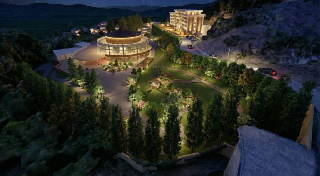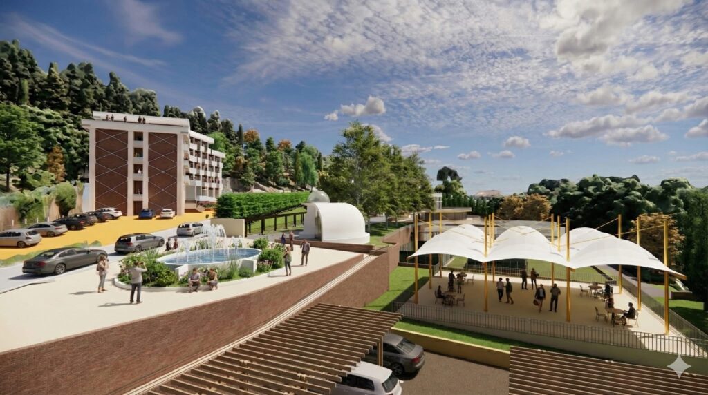Le immagini di progetto restituiscono l’idea di un intervento che ricompone l’area come sistema unitario, con un cuore architettonico riconoscibile e una sequenza di spazi aperti pensati per l’esperienza del benessere.