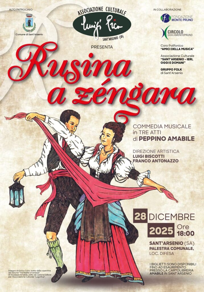 L’appuntamento è da non perdere. Domenica 28 dicembre (inizio ore 18:00) a Sant’Arsenio, nella Palestra Comunale in località Difesa, sarà messa in scena la commedia musicale in tre atti di Peppino Amabile “Rusina ‘a zengara”. L’iniziativa, fortemente voluta dall’Associazione Culturale “Luigi Pica” di Sant’Arsenio, si avvale dell’Alto Patrocinio del Comune di Sant’Arsenio e della collaborazione della Fondazione Monte Pruno, del Coro Polifonico “Amici della Musica”, dell’Associazione Culturale “Sant’Arsenio – Ieri, oggi e domani” e del Gruppo Folk locale. La direzione artistica è affidata a Luigi Biscotti e Franco Antonazzo, che hanno assegnato la parte dello “speziale” a Gabriele Mare, medico di professione. I biglietti per assistere alla manifestazione sono disponibili, fino ad esaurimento posti, presso la Cartolibreria Amabile di Sant’Arsenio.