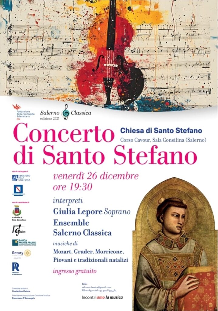 Venerdì 26 dicembre, alle ore 19:30, nella suggestiva Chiesa di Santo Stefano in Corso Cavour a Sala Consilina, si terrà il tradizionale Concerto di Santo Stefano, un appuntamento musicale di grande valore artistico e umano, con ingresso gratuito. Protagonisti della serata saranno il soprano Giulia Lepore e l’Ensemble Salerno Classica, che eseguiranno un raffinato programma con musiche di Mozart, Gruber, Morricone, Piovani e tradizionali natalizi, offrendo al pubblico un percorso sonoro capace di unire spiritualità, emozione e bellezza, nel pieno spirito del Natale.