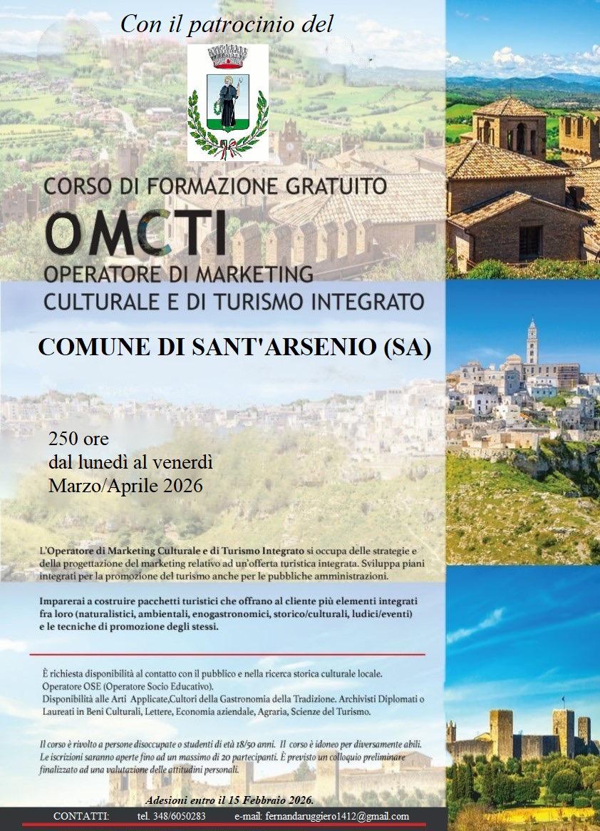 Il Comune di Sant’Arsenio, guidato dal sindaco Donato Pica, annuncia l’avvio del corso di formazione gratuito “OMCTI – Operatore di Marketing Culturale e di Turismo Integrato”, un’iniziativa promossa con il patrocinio dell’Amministrazione comunale e inserita nel quadro delle politiche locali dedicate alla crescita occupazionale e alla valorizzazione del territorio. L’obiettivo è rafforzare le competenze professionali nel settore turistico-culturale, considerato una leva strategica per lo sviluppo economico e sociale dell’area.