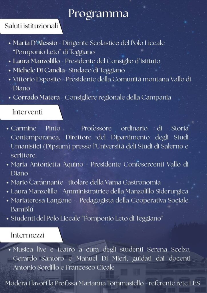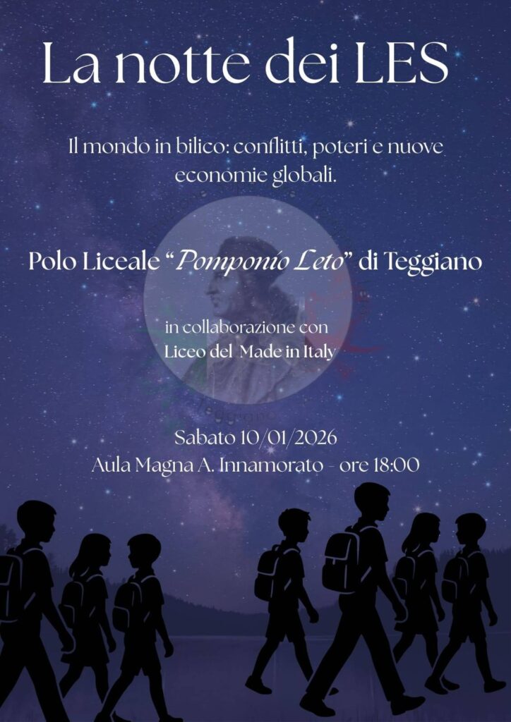 Il Polo Liceale “Pomponio Leto” partecipa a “La notte dei LES”, iniziativa nazionale che vede protagonista l’indirizzo del Liceo Economico Sociale, ma con un’innovazione particolare: la collaborazione del Liceo Made in Italy. Sabato 10 gennaio infatti, a partire dalle ore 18:00, presso l’aula magna “A. Innamorato” della sede centrale del Leto, si terrà l’incontro con diverse personalità istituzionali, al fine di chiarire gli aspetti salienti delle moderne economie globali, con attenzione particolare all’istruzione ed alla formazione dei futuri attori che la scuola prepara già da subito per la costruzione di una comunità umana libera da conflitti e poteri monopolistici.