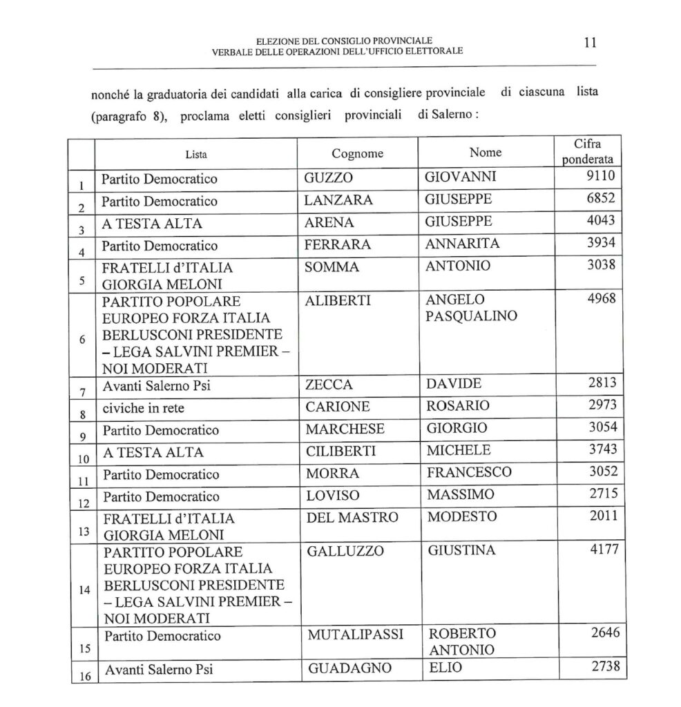 Si è chiusa con un’affluenza molto alta la tornata elettorale per il rinnovo del Consiglio provinciale di Salerno, svoltasi domenica 11 gennaio, secondo quanto certificato dal verbale ufficiale dell’Ufficio Elettorale della Provincia. Alla chiusura delle operazioni di voto hanno partecipato 1.772 elettori su 2.023 aventi diritto, pari a un’affluenza complessiva dell’87,59%. Un dato che conferma il forte coinvolgimento degli amministratori locali chiamati a esprimersi nel voto di secondo livello.
