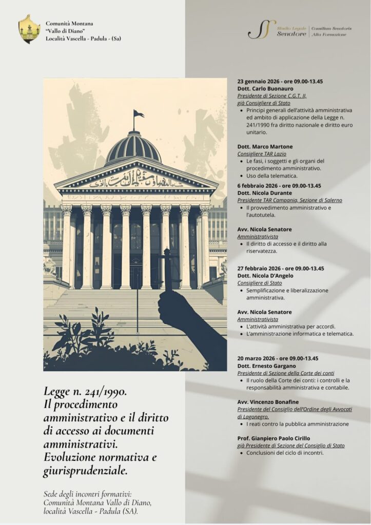 La Comunità Montana Vallo di Diano presentare il nuovo ciclo di incontri formativi del primo trimestre 2026. Saranno dedicati al procedimento amministrativo e al diritto di accesso ai documenti amministrativi, con un focus sull’evoluzione normativa e giurisprudenziale.