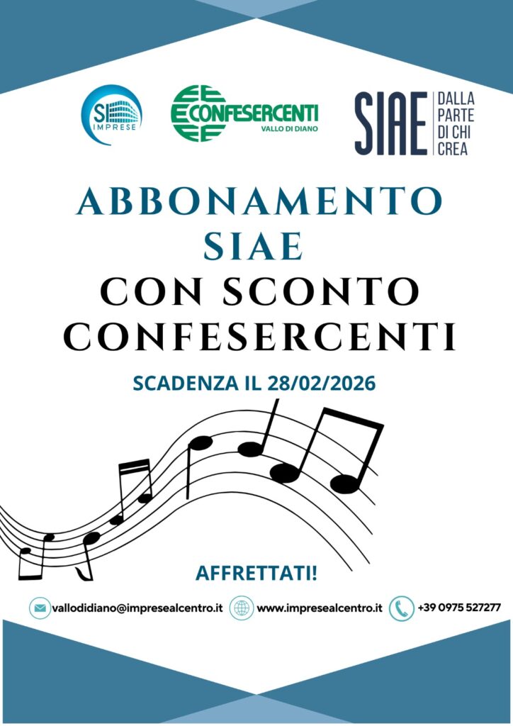 Riparte anche quest’anno l’abbonamento SIAE con sconto Confesercenti, un’opportunità concreta per le attività del Vallo di Diano che utilizzano musica e intrattenimento nei propri locali.