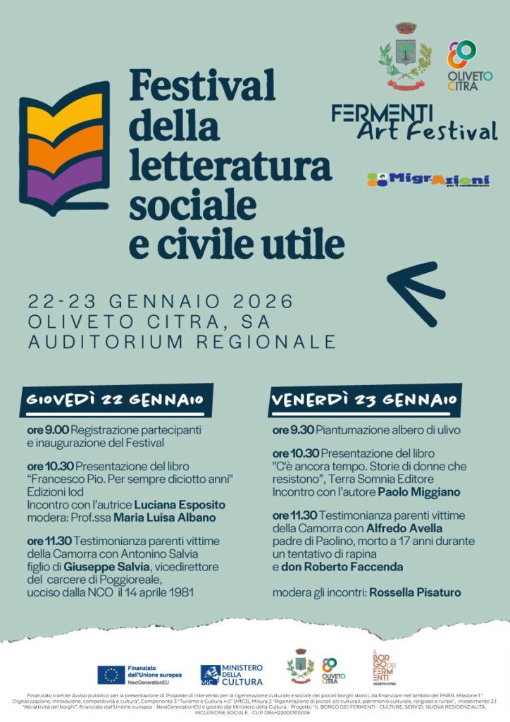 Dal 22 al 23 gennaio, Oliveto Citra ospiterà la prima edizione del “Festival della Letteratura Sociale e Civile Utile”, un appuntamento che nasce con l’obiettivo di creare un luogo di incontro per idee, storie e riflessioni, mettendo al centro i grandi temi della giustizia sociale, della memoria, della legalità e dell’impegno civile. L’iniziativa è promossa dal Comune di Oliveto Citra e dall’associazione Migr-Azioni ETS, con l’intento di sensibilizzare la comunità, e in particolare le nuove generazioni, su questioni sociali fondamentali, dando voce a chi troppo spesso resta ai margini.