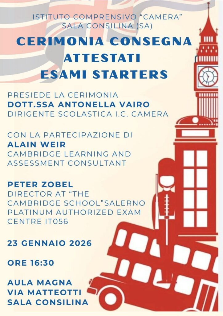 Emozione, sorrisi e grande partecipazione hanno accompagnato la cerimonia di consegna degli attestati Cambridge “Starters” che si è svolta presso l’Aula Magna di via Matteotti, a Sala Consilina.