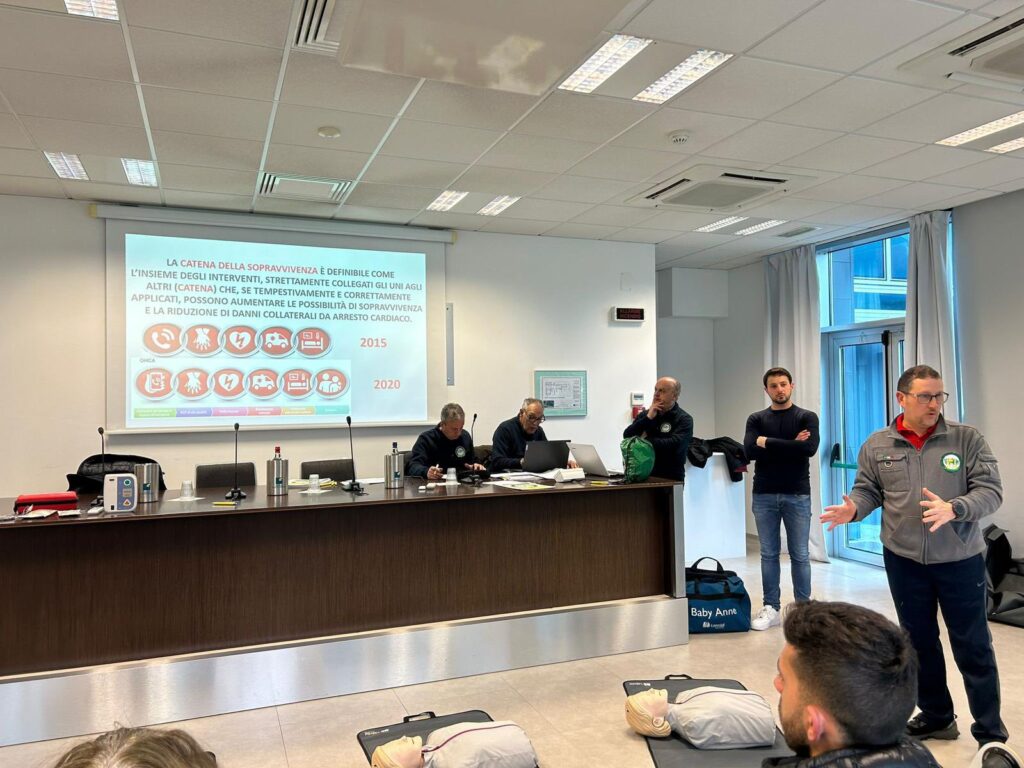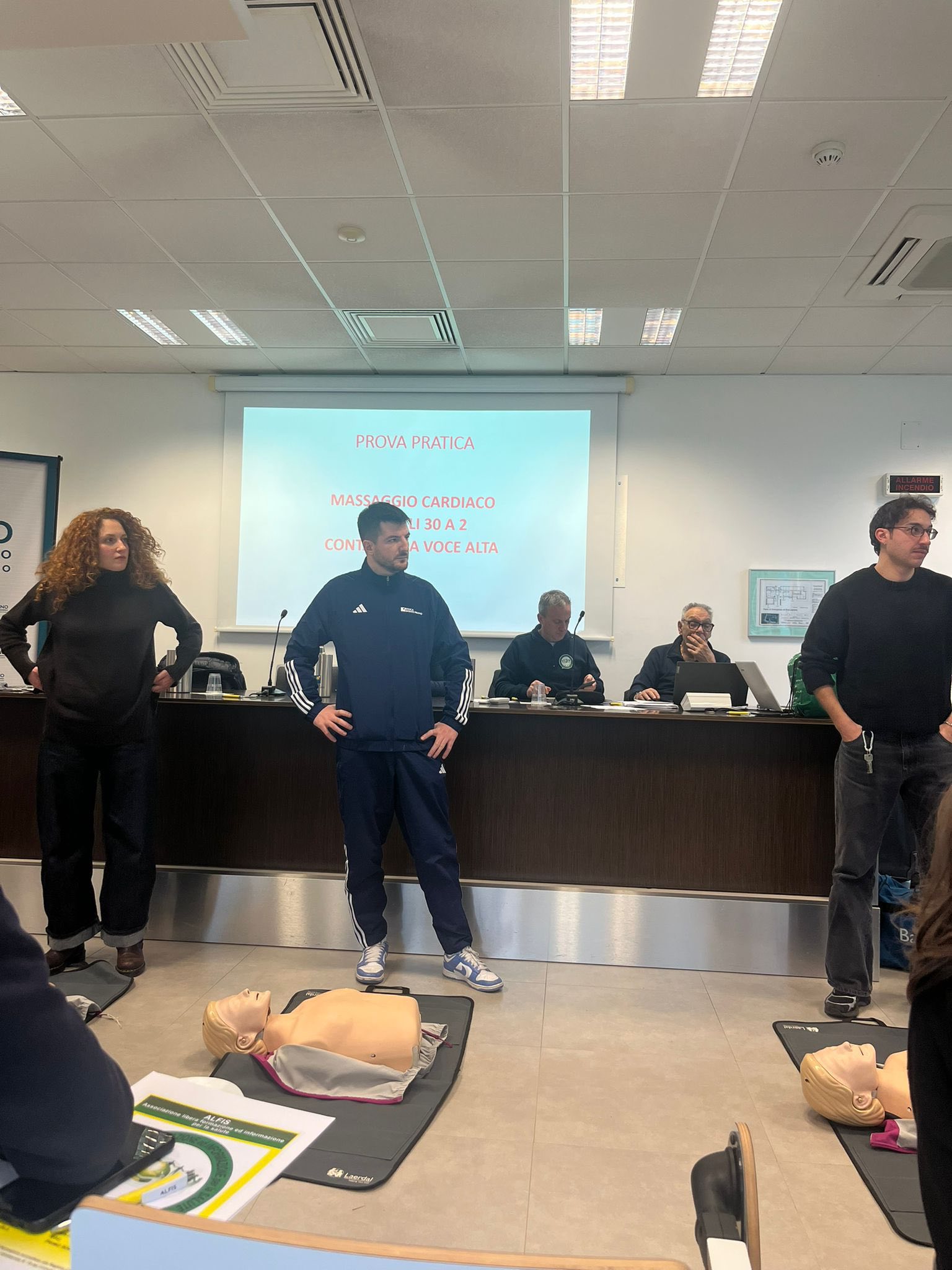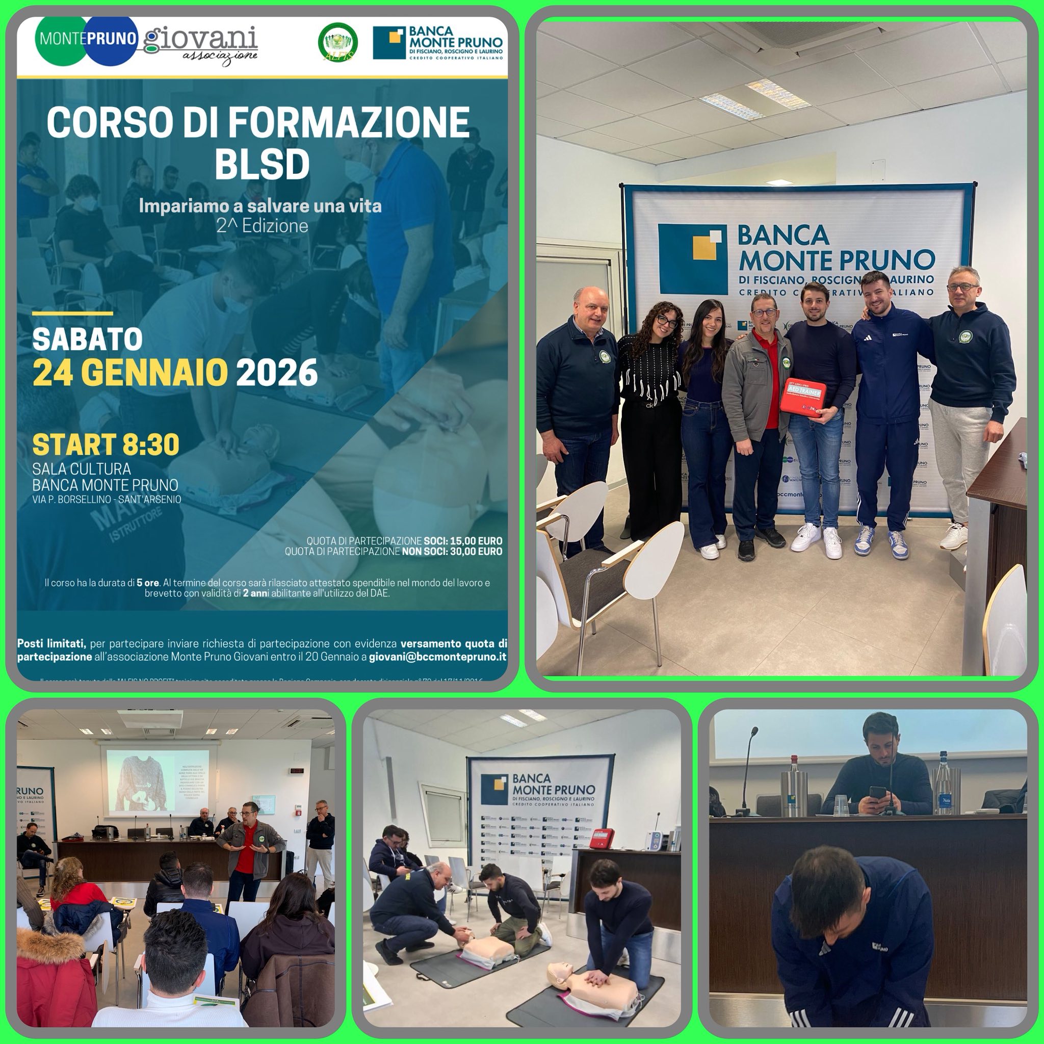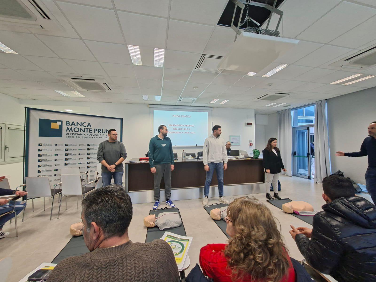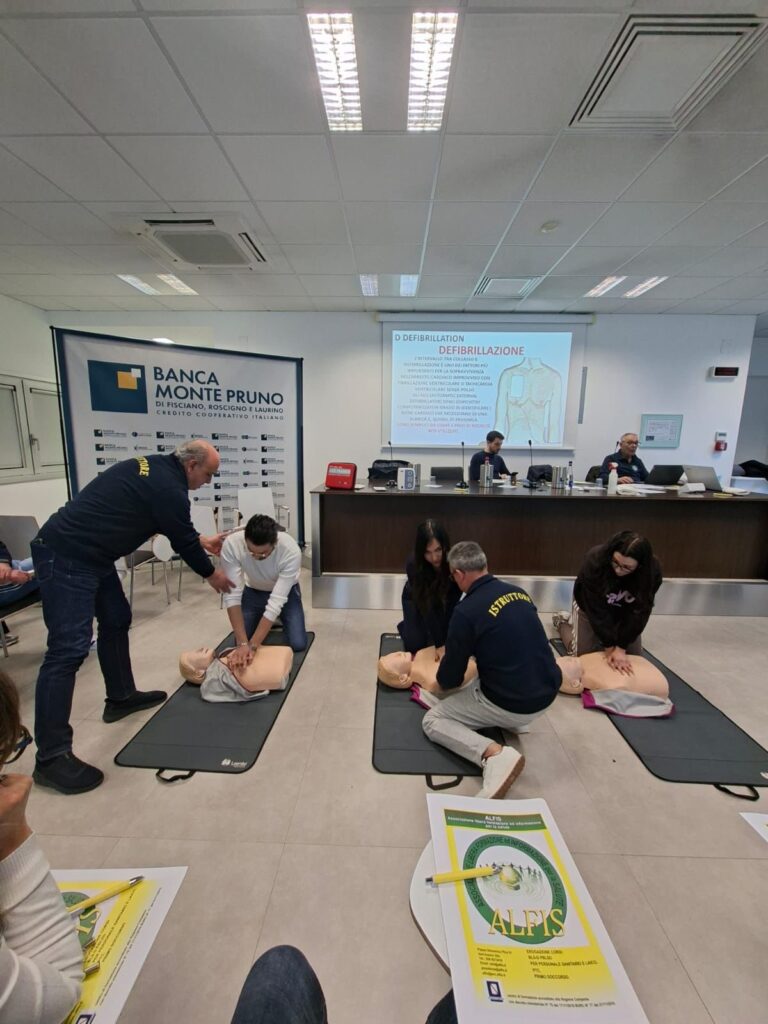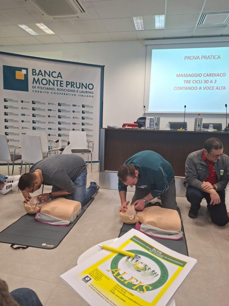 Il corso B.L.S.D. (Basic Life Support Defibrillation), della durata di cinque ore, è stato organizzato con il supporto della Banca Monte Pruno e dell’Associazione Alfis, consentendo ai partecipanti di apprendere le procedure fondamentali di rianimazione cardiopolmonare, l’uso del defibrillatore semiautomatico e la manovra di Heimlich, attraverso sessioni teoriche e pratiche.